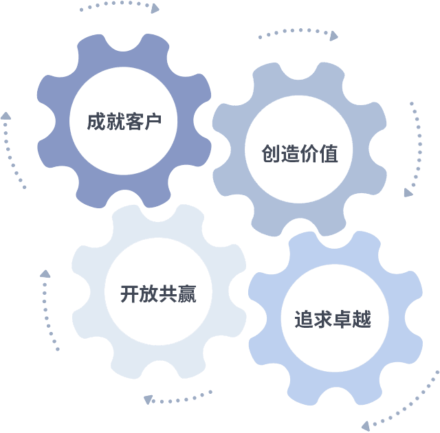 成就客户是一切决策的出发点,,,,创造价值是衡量所有工作的标准,,追求卓越是我们做事做人的态度,,开放共赢是我们的格局也是最终的结果。。。价值观的齿轮环环相扣,,,推动着组织里的每个人不断向前。。。。